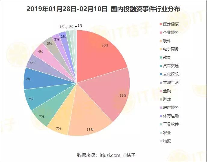 從行業(yè)分布來看,醫(yī)療健康是春節(jié)期間發(fā)生投融資事件最多的行業(yè),共出現(xiàn)18起,占比20%;其次,企業(yè)服務(wù)行業(yè)位列第二,發(fā)生16起投融資并購事件,占比18%;硬件行業(yè)位列第三,發(fā)生13起投融資并購事件,占比15%。